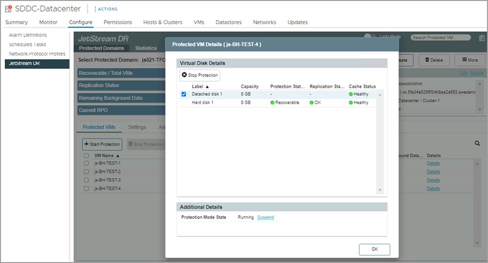 - From the JetStream DR GUI, open the details of the of the protected VM and select the detached disk to stop protection.