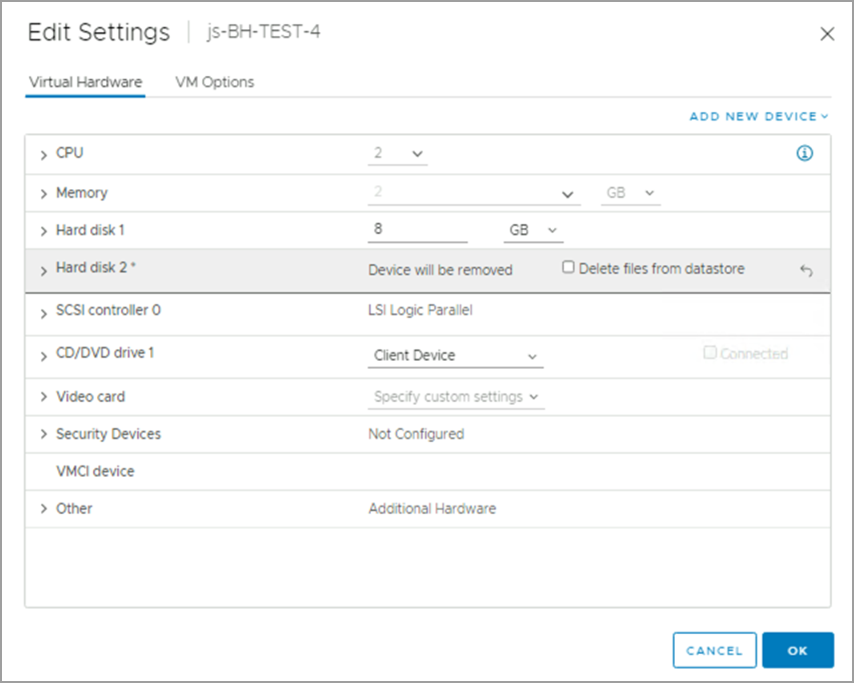 - Right-click the VM then select Edit Settings > Detach/remove disk.