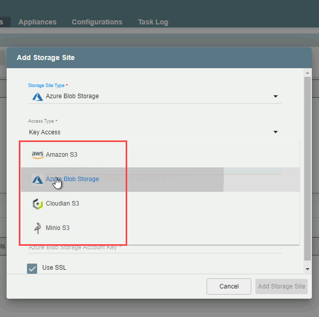 - You will be asked to provide object storage access credentials based upon the storage site type selected: Azure Blob Storage, AWS S3, Cloudian or MinIO.