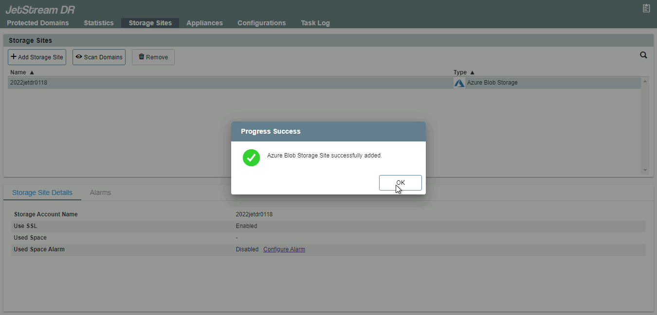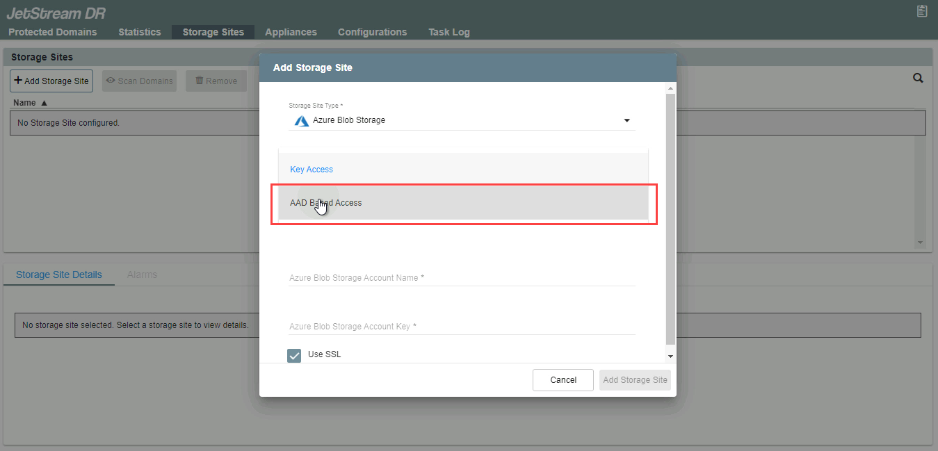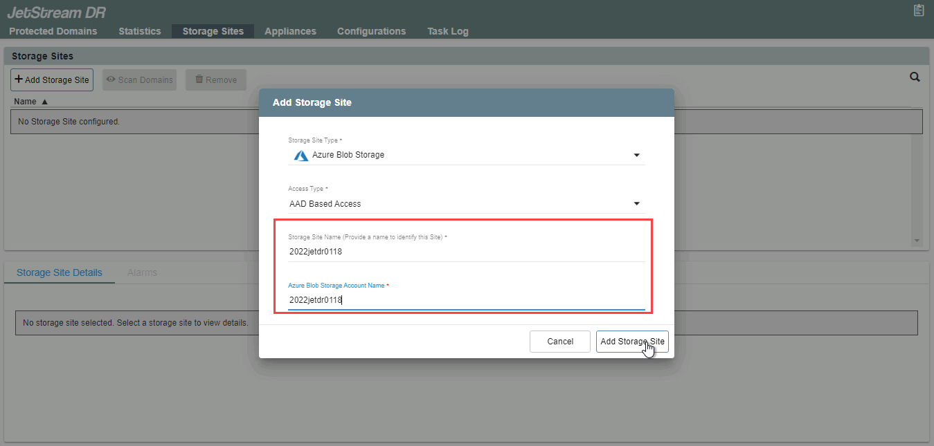 - Enter the Storage Site Name and Azure Blob Storage Account Name then click the Add Storage Site button.