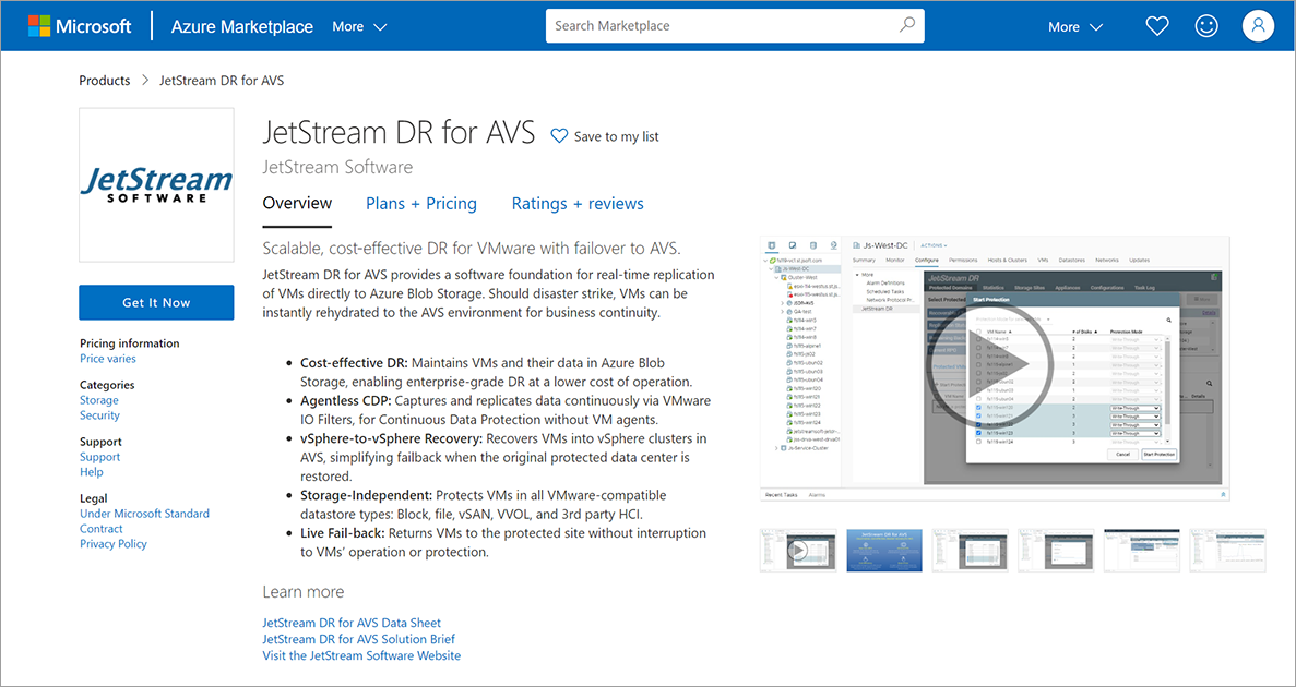 Figure 8: JetStream DR for AVS software listing in Azure Marketplace.