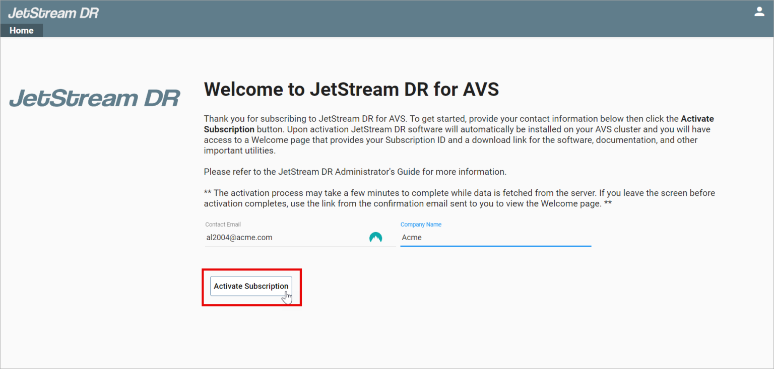 • A follow up screen will display the issued JetStream DR for AVS Subscription ID. Record and save the subscription ID number. It is necessary for connecting to Azure object storage and protecting VMs and workloads. You may need to re-enter this information at a later point in time if the the software or connection to Azure object storage becomes disconnected or changed.