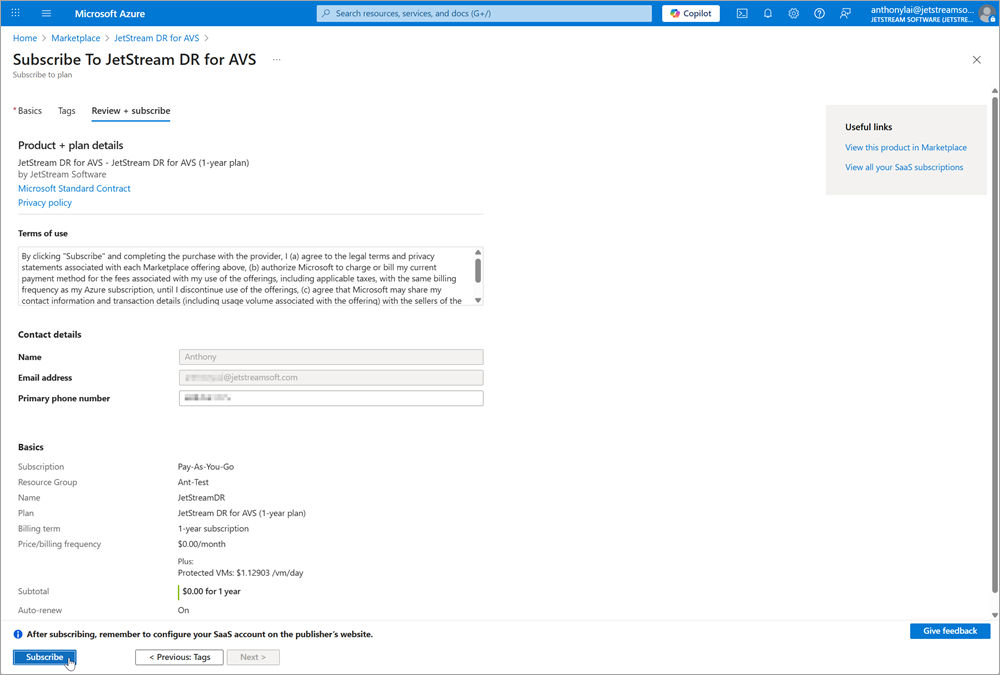 Note: Make sure you have the Azure user privilege to subscribe to new services. If you do not, you may see a message asking you to justify the subscription to JetStream DR for AVS. After making the request, check with your business admin to have them approve the transaction on Azure Marketplace.