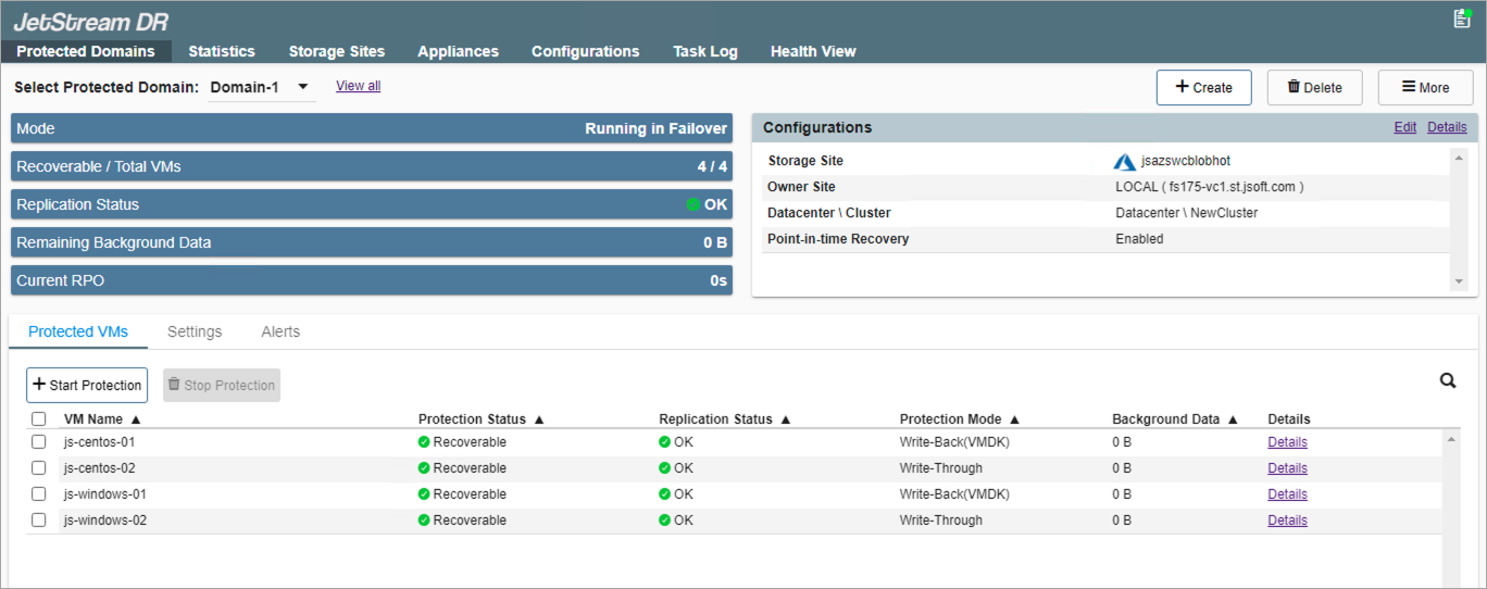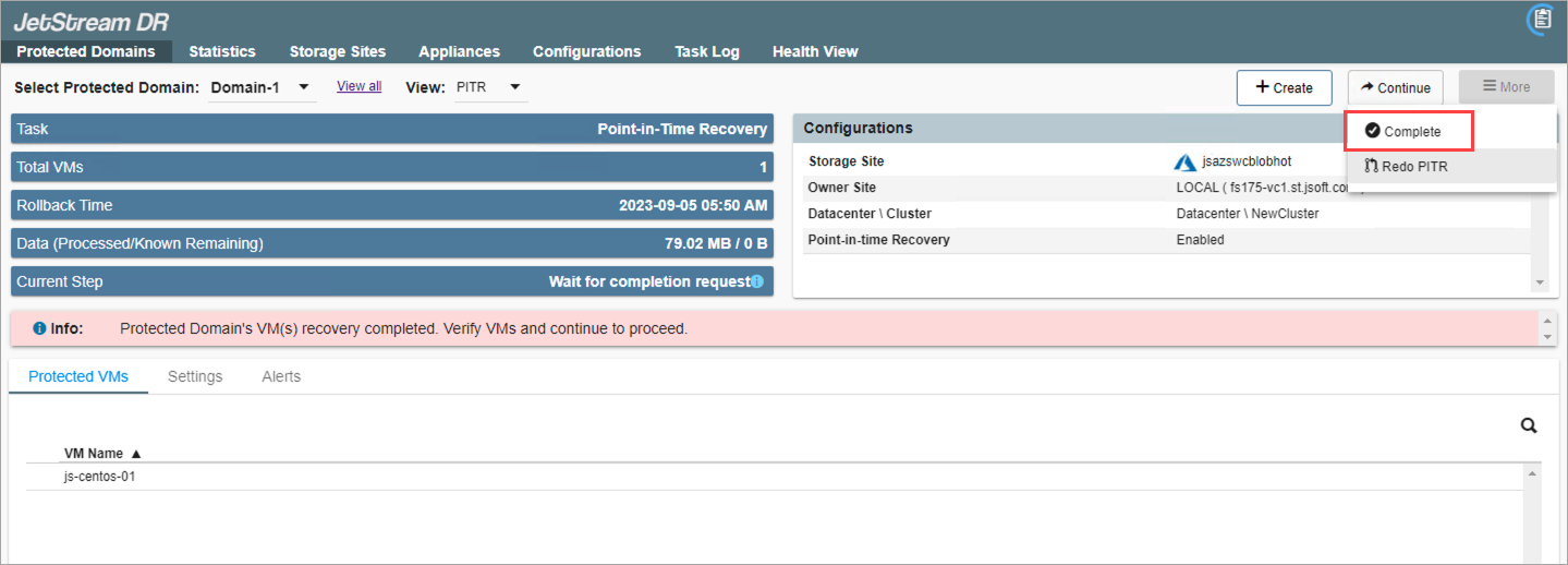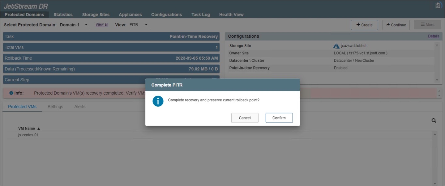 - Upon exiting PITR, VMs and data will have been restored to the rollback point and protection of the Domain automatically resumes.