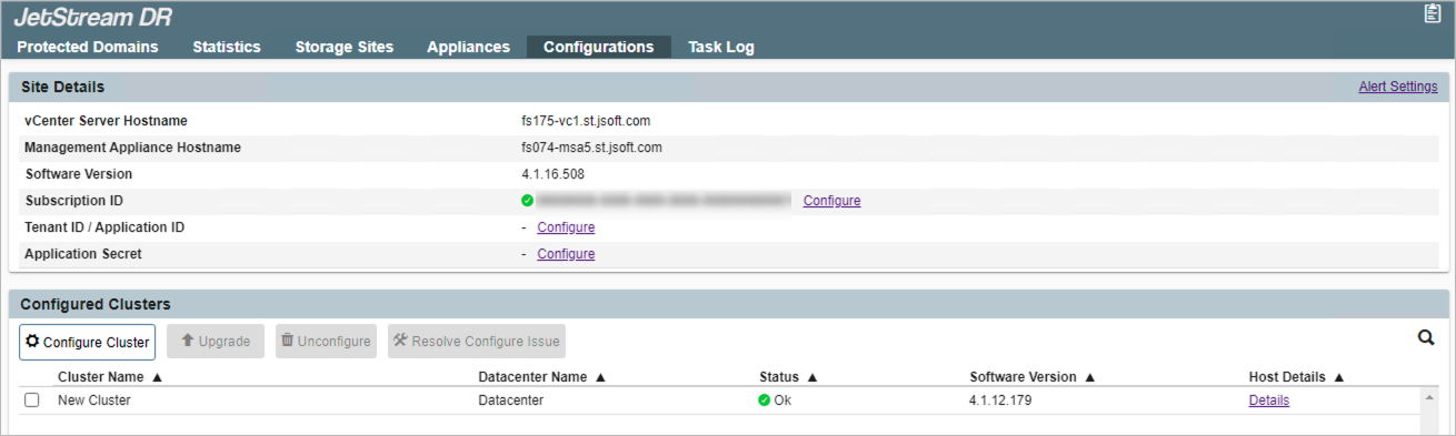 Details about the site and all its configured clusters appear on the Configurations screen.