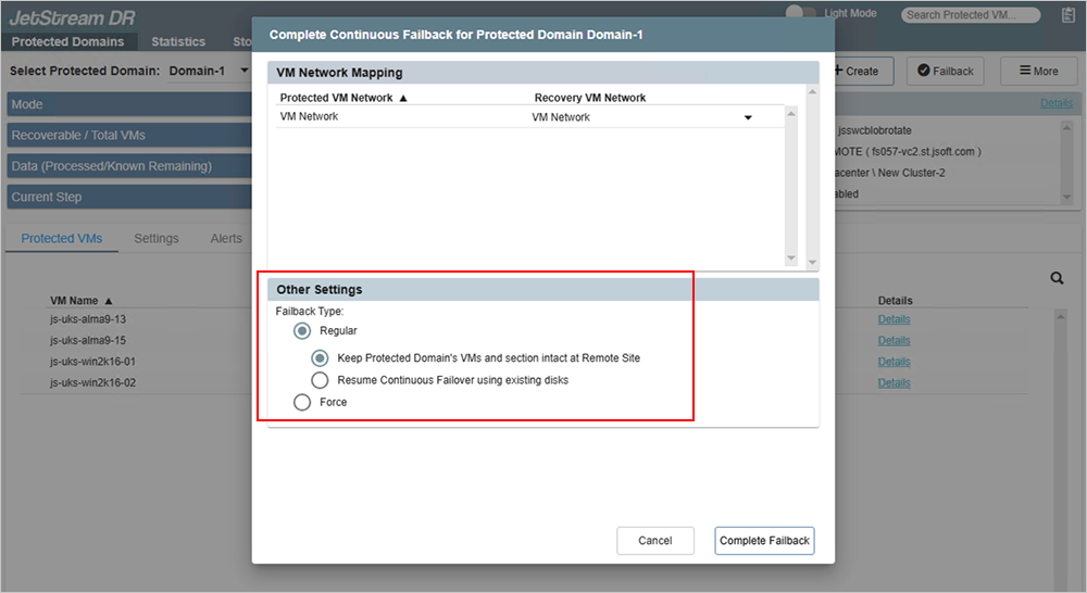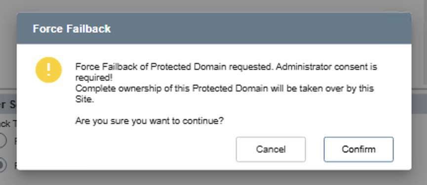 - During failback, VMs will be gracefully shut down and all selected Domains stopped at the failover site before transferring ownership back to the primary site. If any selected Domain from the failover site becomes unavailable, graceful shutdown cannot occur and failback will be unable to proceed. The Force failback option allows the primary site to "forcefully" take ownership of the Domain allowing failback to be completed.