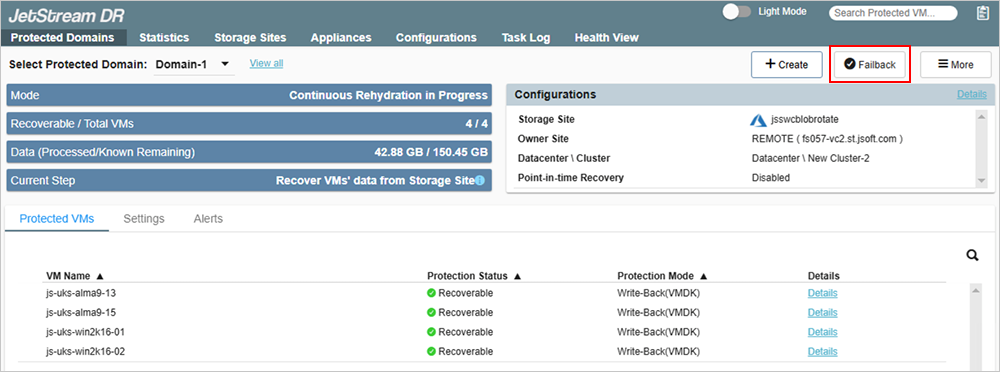 When necessary, (after data has been synchronized and the operating mode is "Continuous Rehydration in Progress") click the Failback button to immediately failback VMs and workloads to the primary site.