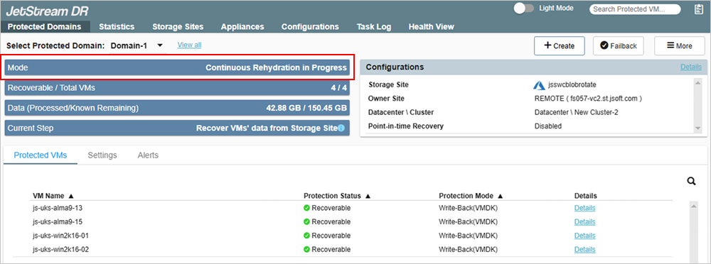 - Once data is synchronized between the sites, the operating mode will indicate “Continuous Rehydration in Progress.”