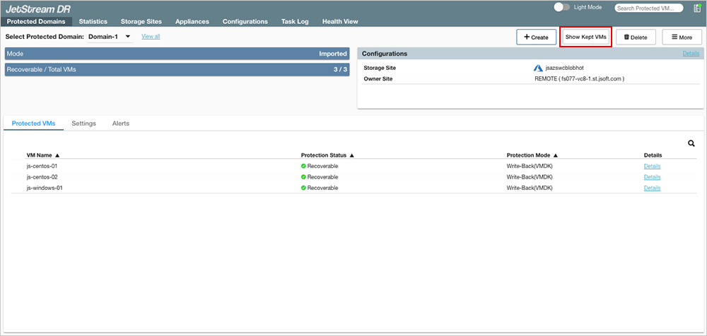 - Click the Show Kept VMs button on the Protected Domains screen to view a list of all VMs that were preserved at the remote site.