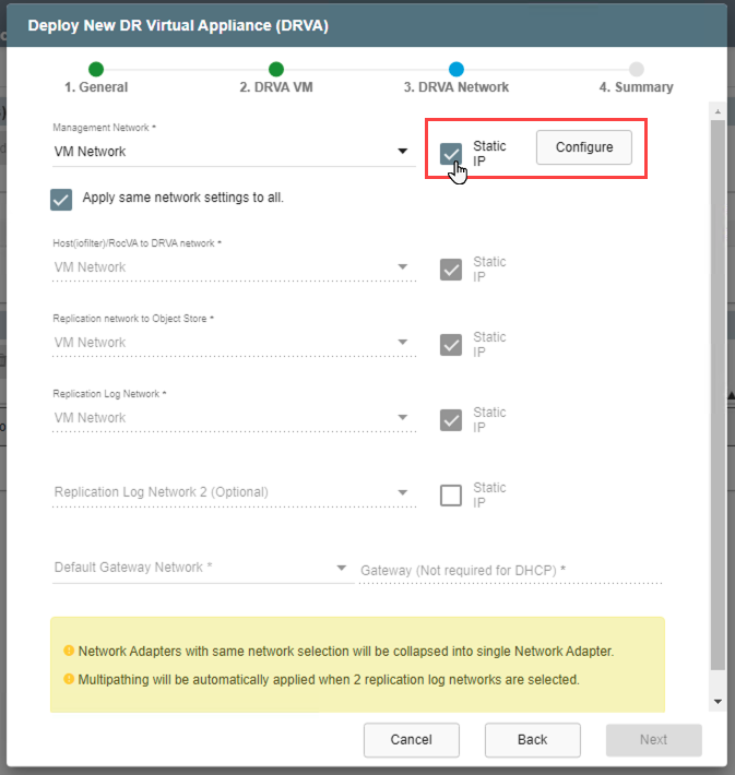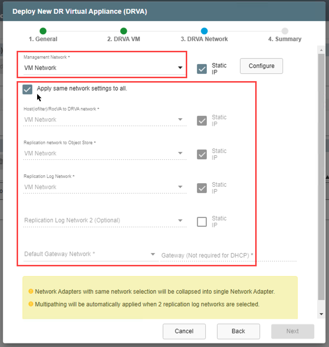 - If a single network will be used for the DRVA, leave the option "Apply same network settings to all" selected.