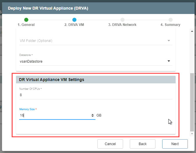 - On the upper portion of the screen, make selections from the drop-down menus to specify details about the location for the DRVA including the specific datastore on which it will reside.