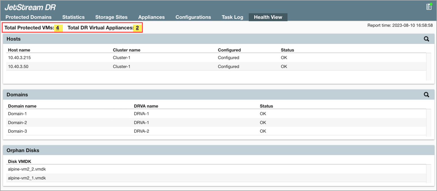 The top of the Health View screen indicates the number of protected VMs and configured DRVAs currently being handled by the system.