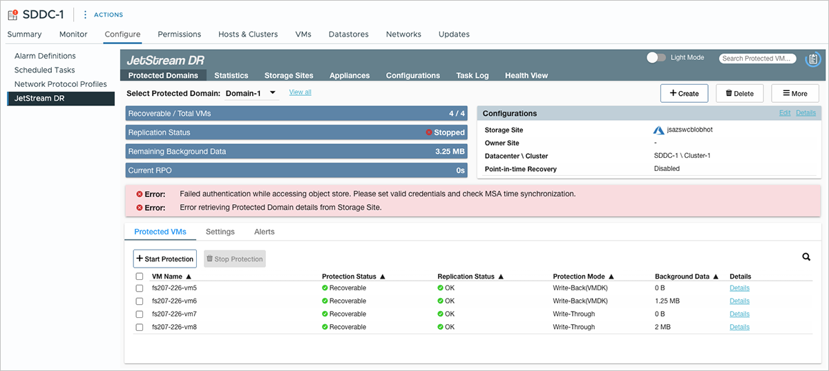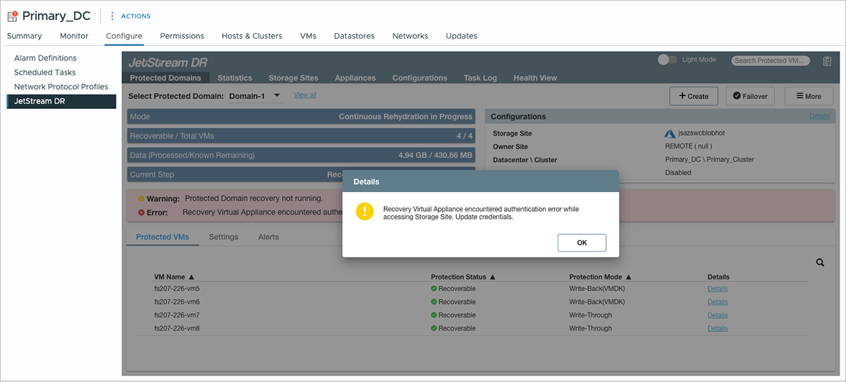 If the access key of the Azure storage account used by JetStream DR for replication is rotated, the JetStream MSA and appliances will lose access to the object store and cease to function optimally.