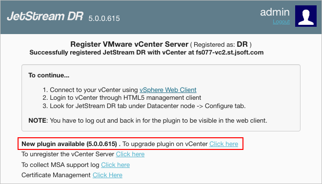 This step copies all configurations, database etc. from the old MSA to the 5.0 MSA. - The upgraded plug-in should now be available. If the vCenter plug-in does not appear automatically updated, go to the MSA https and look for the message that a new version of the plug-in is available. Click the link to upgrade the plug-in on vCenter.