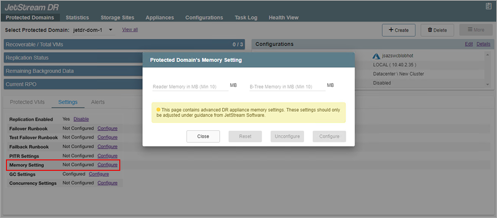 This setting controls runtime memory allocation for DRVAs within the Protected Domain. The Protected Domain Memory Setting dialog window appears when the Memory Setting Configure link is clicked.