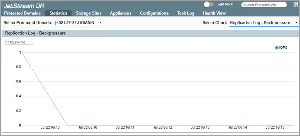 The Replication Log Backpressure graph displays the actual number of operations that were delayed due to write throttling. "Backpressure" occurs when network bandwidth is insufficient to handle the total volume of replication and application traffic. Under such circumstances, write throttling is applied to reduce DR replication traffic to free up network bandwidth in order to maintain application performance.