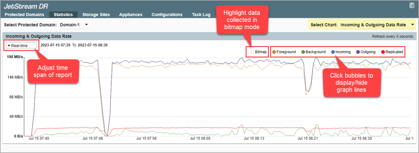 - Replicated data (from DRVA to object store after compression): Draws a line representing the rate at which Domain data is being replicated to the cloud object store. This provides insight into the performance of the network between the primary site and the storage site, and the efficiency with which data is written to the object store.