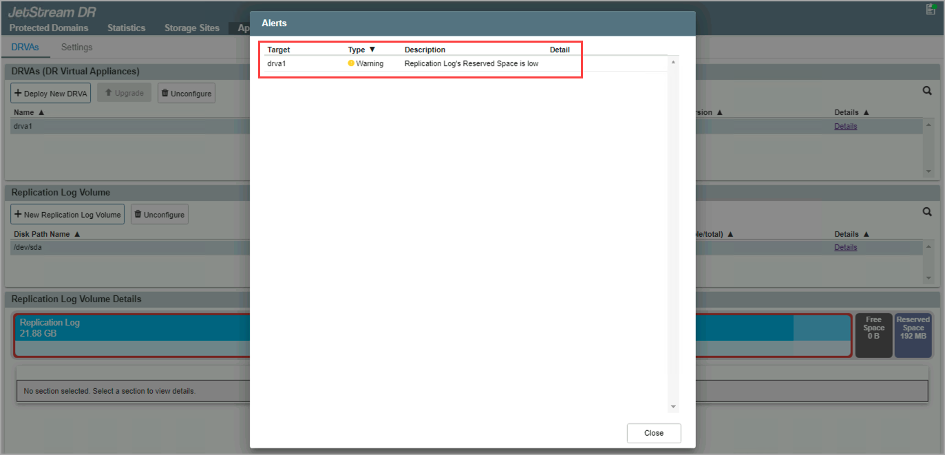 - An alert message is triggered indicating a problem with the Domain log space of Domain-1.
