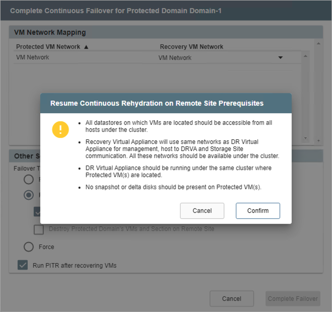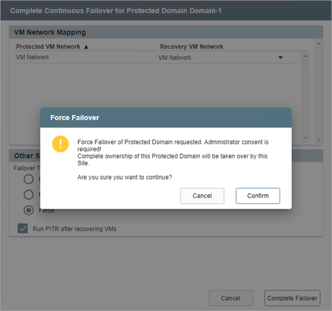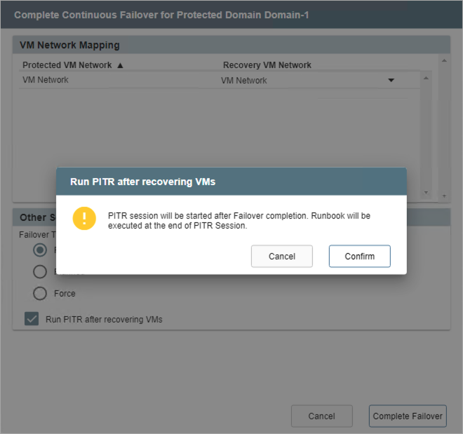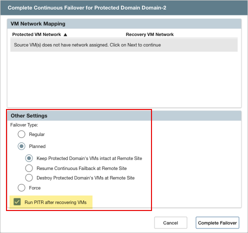 - When completing continuous failover, specify a failover type and select the Run PITR after recovering VMs checkbox option.