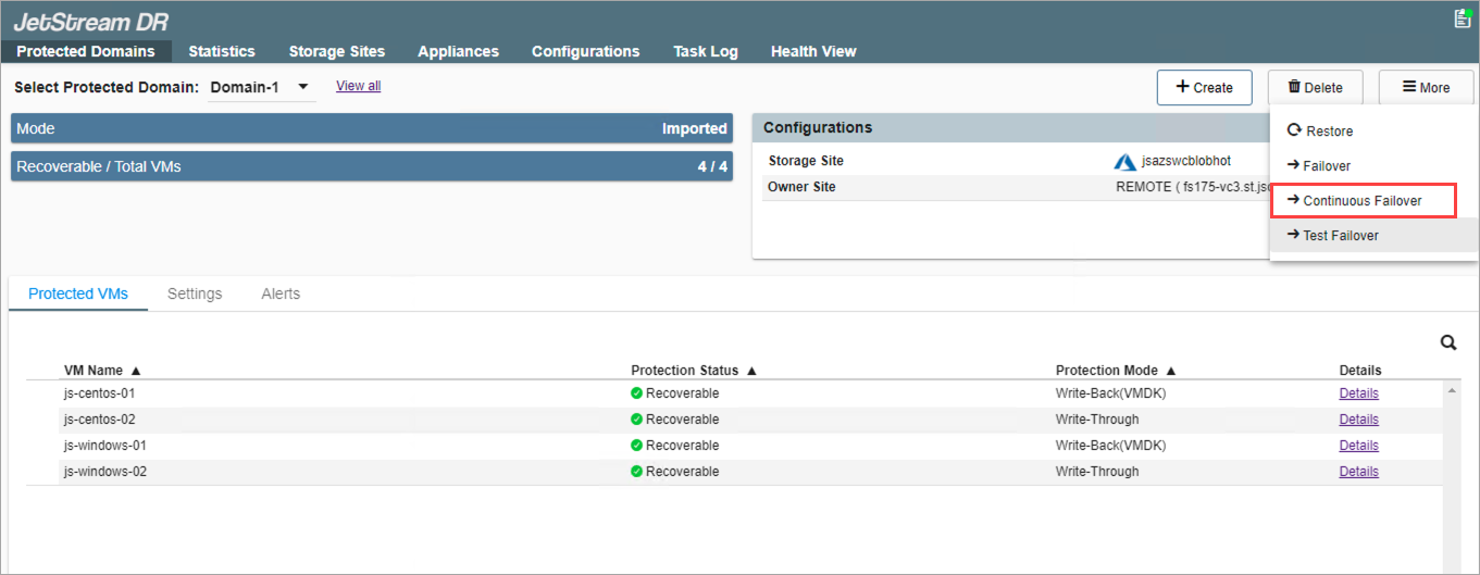 - On the Protected Domains screen, open the More menu and select the Continuous Failover option.