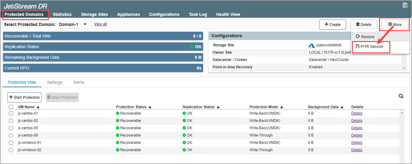 - On the Protected Domains screen, open the More menu and select the PITR Session option.