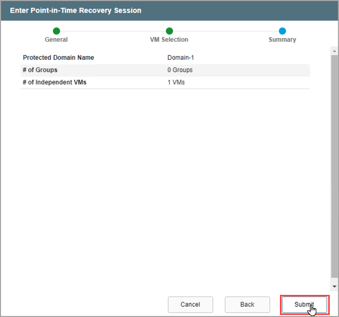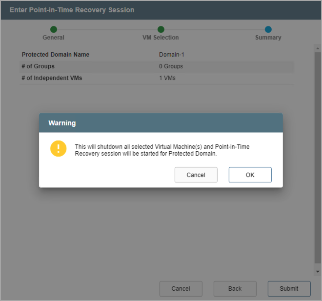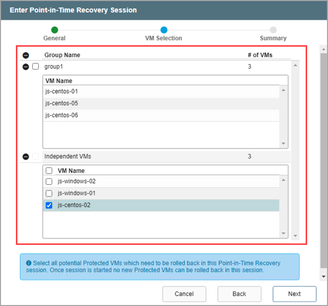 Note: After a PITR session has been started, additional VMs from the Protected Domain cannot be added to the session for rollback. A new PITR session should be started to access them.
