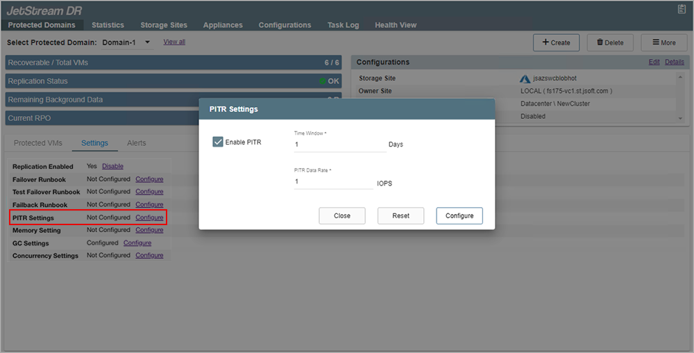 Point-in-Time Recovery (PITR) allows VMs and data from a particular time in the past (last "known good" point) to be recovered, tested, and then restored. The PITR Settings dialog window appears when the PITR Settings Configure link is clicked allowing PITR to be enabled and configured for the Protected Domain. Additional information about PITR is provided under the section Point-In-Time-Recovery.