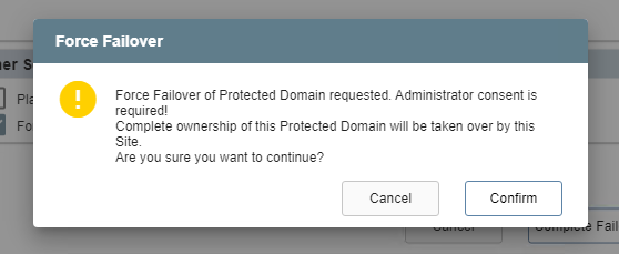 - A dialog window will appear asking the user to confirm that complete ownership of the Domain can be taken over immediately by the recovery site.