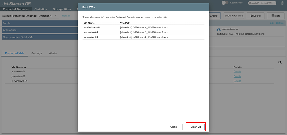 - If the "Kept VMs" are no longer needed at the remote site, click the Clean Up button delete all the VMs and the corresponding replication log in the DRVA. Cleanup can also be manually performed by the user, if necessary.