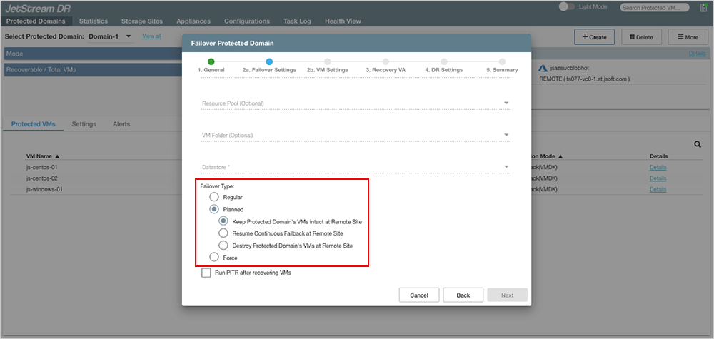 Multiple options are available to control the state of the protected site and ownership of VMs and data after failover has been completed. Failover can be completed in one of three ways: Regular, Planned, or Forced.
