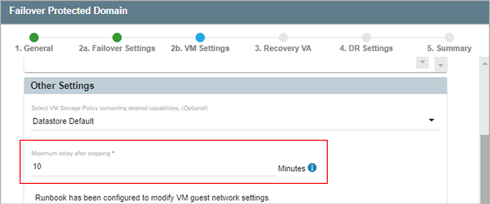 - Maximum delay after stopping option: During planned failover, VMs running on the primary site are shut down as final bits of data are transferred prior to switching to the recovery site. Depending upon the amount of remaining data, this process may create some downtime on the VMs. The maximum delay function allows a hard limit to be set on the allowable downtime introduced by this process.