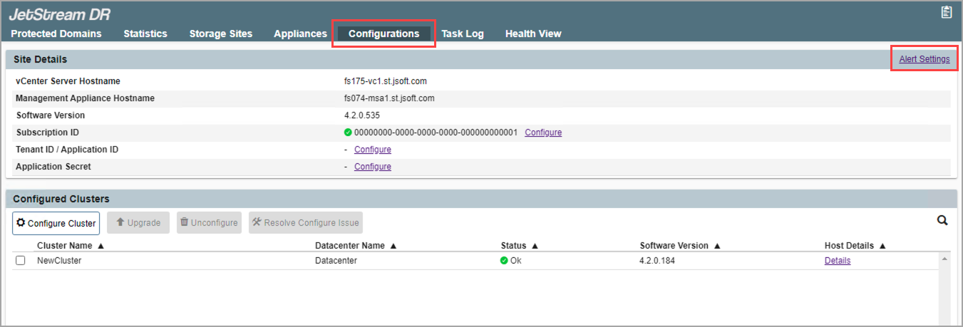 1. From the JetStream DR interface of the management server, go to the Configurations screen.