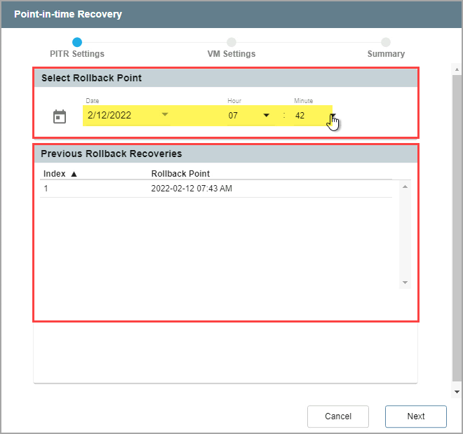 Note: When new rollback points are recovered to replace previous ones for testing, the specific points of time of the older rollback points will no longer be available for selection. If the point in time you wish to use is unavailable, a best practice is to select a new point in time “just before” the rollback point you prefer, or start over again with a new PITR session.