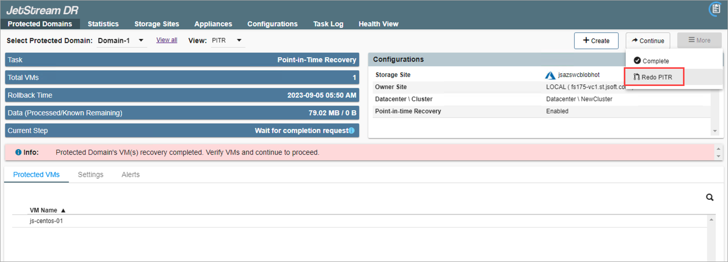 - Different points in time and configurations can be tested until the desired one is found and then the PITR session can be completed to restore the VMs and data to the recovery site.