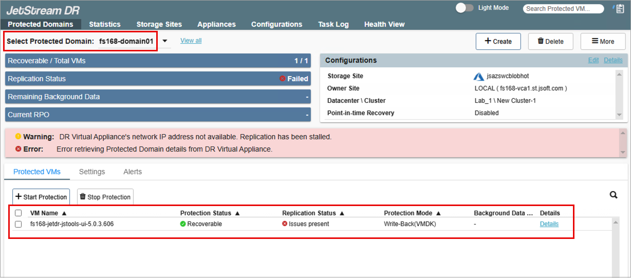 The Protected Domain and its VMs to restore should appear in the JetStream DR UI.