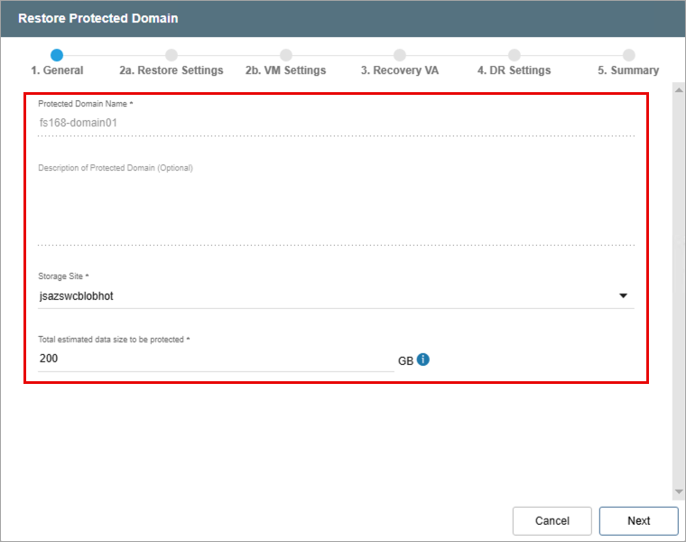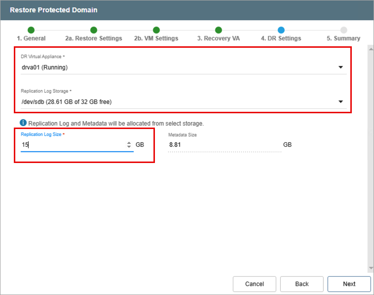 - Specify a Replication Log Size. (Note: Metatdata Size is not directly editable. It is derived from the Total estimated data size to be protected specified when the Protected Domain was configured – it can also be adjusted from the General step, above.)