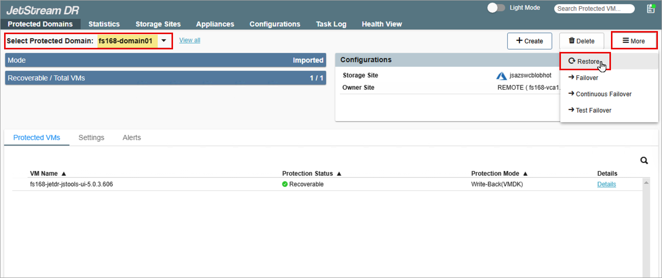 - On the Protected Domains screen, select the Domain then open the More menu and click the Restore option.