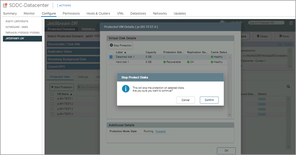 - From the JetStream DR GUI, open the details of the of the protected VM and select the detached disk to stop protection.