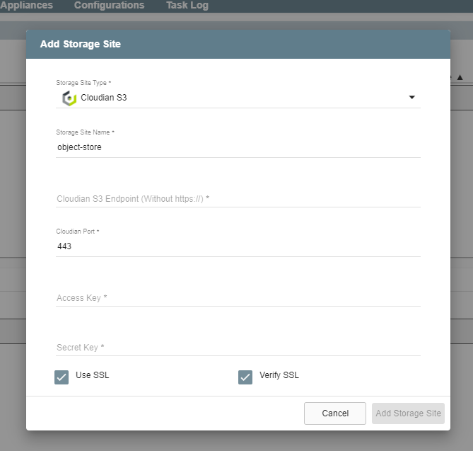 ConfigurationStorage Sites TabAdd a Storage Site Cloudian Object Storage Credentials To use Cloudian Object Storage: Select Cloudian S3. Enter credentials to connect to Cloudian HyperStore. Click the Add Storage Site button. Figure 69: Enter storage site details. Also see: Configure a New Storage Site Set up a Protected Domain