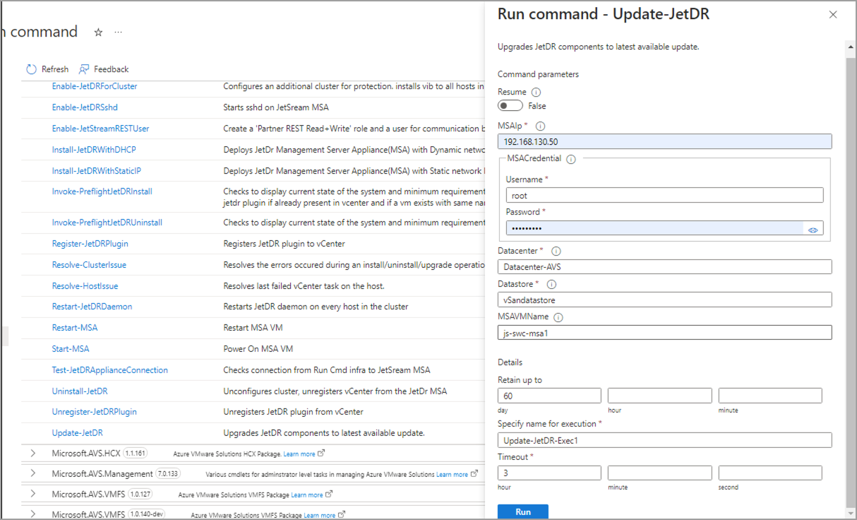 - Run the cmdlet Update-JetDR entering the following required parameters: