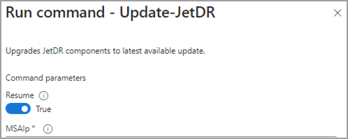 - If the upgrade fails at any point after updating the MSA, resume the process by re-running the Update-JetDR cmdlet with the Resume = True option enabled. (Make sure the upgrade parameters are complete and correct.)
