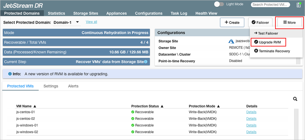 - Navigate to: (Datacenter) > Configure > JetStream DR > (Protected Domain with CFO running) > More.
