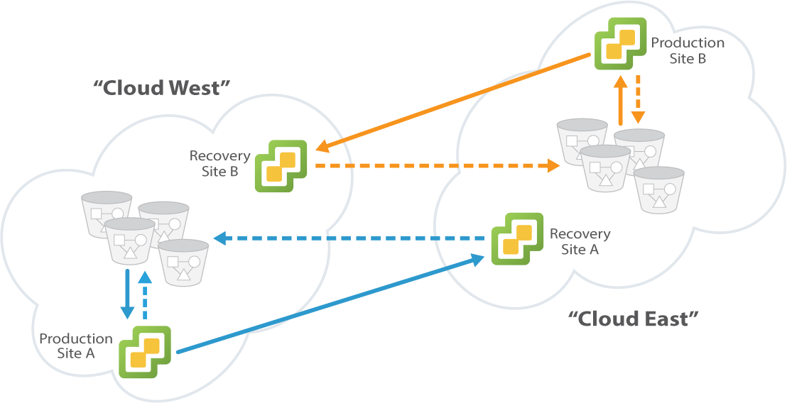 In this configuration, the cloud services provider hosts its customer’s primary environment in one data center and protects its VMs and their data by continuously replicating to an object store or Blob Storage in another one of its cloud data centers. In the event of an incident, VMs and data are recovered from the object store located in the second data center and can be recovered to either data center via rehydration (DR). This protection can be bi-directional, with data center “A” protecting data center “B”, and vice-versa.