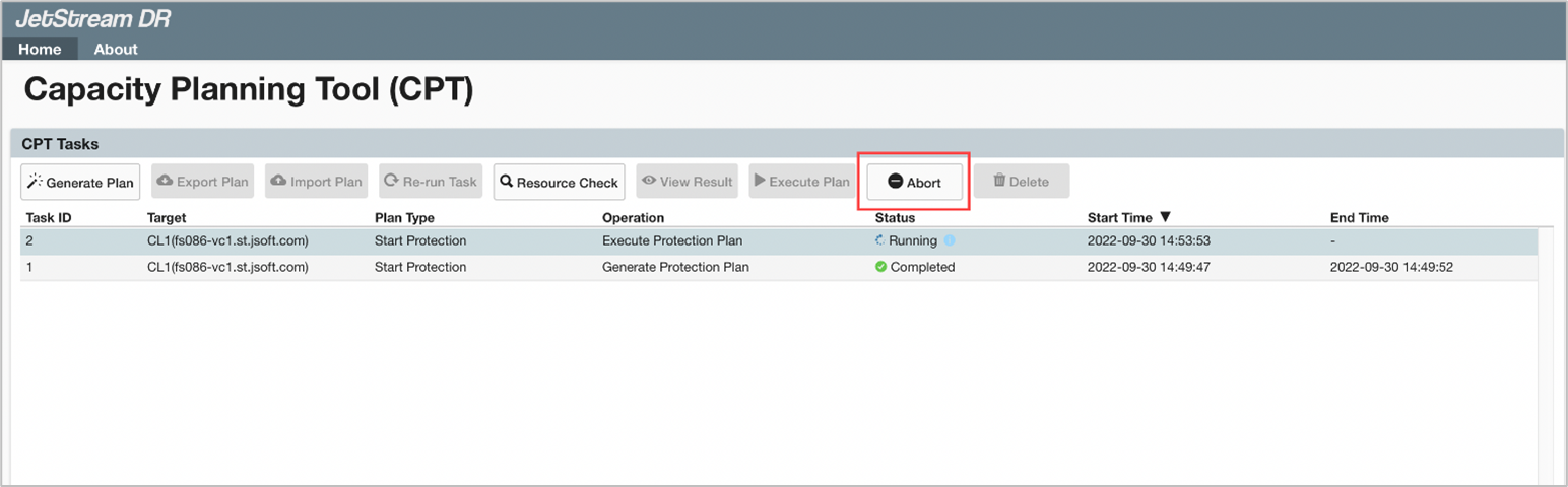 NOTE: Only running tasks can be aborted. After a task has been aborted, it will continue to appear on the task list. It can then be deleted by the user, if desired.