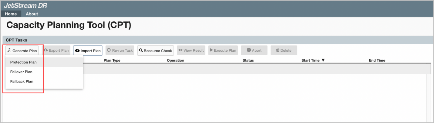 Capacity Planning Tool (CPT)CPT GUICPT User Interface CPT Generate Plan Click the Generate Plan button to display a menu to generate Protection, Failover, and Failback plans. Protection Plan Failover Plan Failback Plan