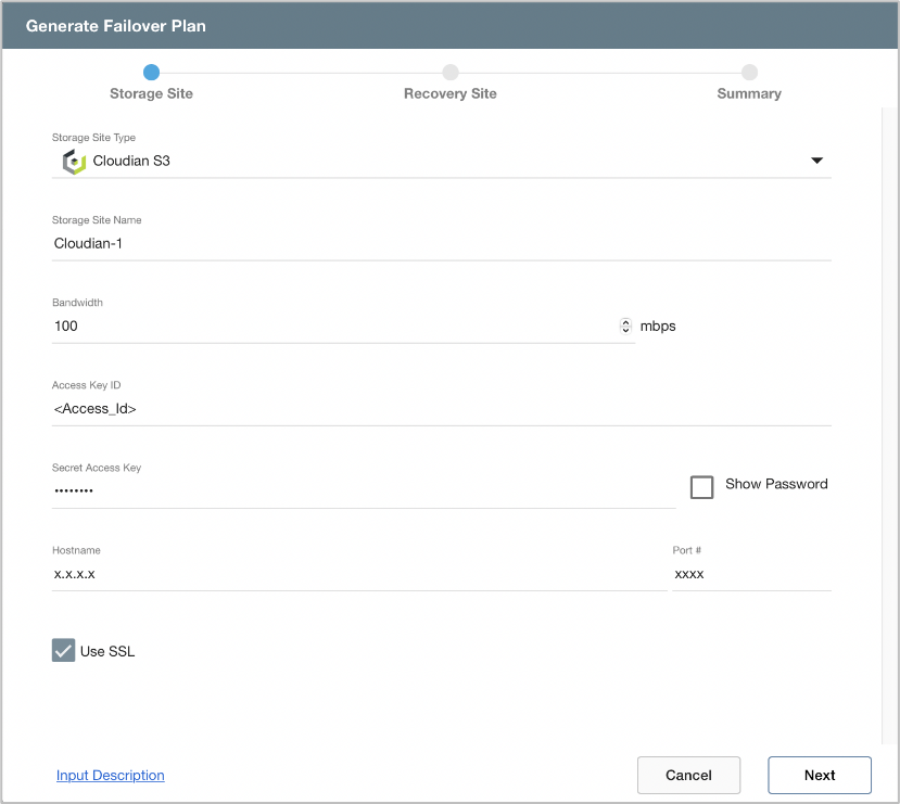 Capacity Planning Tool (CPT)CPT GUICPT User InterfaceCPT Generate PlanFailover Plan (FOP)Failover Plan SetupFailover Plan Setup: Storage Site Cloudian Storage If Cloudian storage will be used, specify the following parameters for it. Storage Site Type Storage Site Name Bandwidth Access Key ID Secret Access Key Hostname Port # Use SSL option