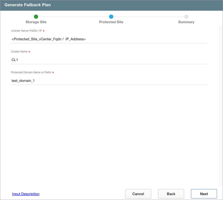 Capacity Planning Tool (CPT)CPT GUICPT User InterfaceCPT Generate PlanFailback PlanFailback Plan Setup Failback Plan Setup: Protected Site Specify parameters about the protected site. Protected Site vCenter Server FQDN / IP Cluster Name Domain Name Prefix