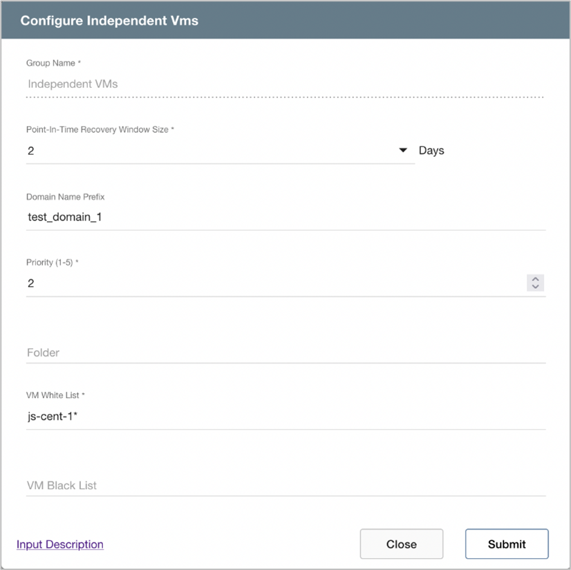 - VM Whitelist: A whitelist value must be specified to select VMs for the protected domain. Use the “*” wildcard to select all VMs.